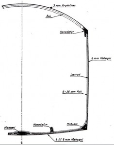 The hull was built from Mahogany, with an internal doped canvas “bag” that would help keep water out. The construction was very similar to modern-day fibre-glass construction. Ash-wood spars were used as “widerons” to increase the strength of the hull width-wise. The hull did not use any formers as we know it, and it can be classified as a very early monocoque construction.