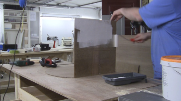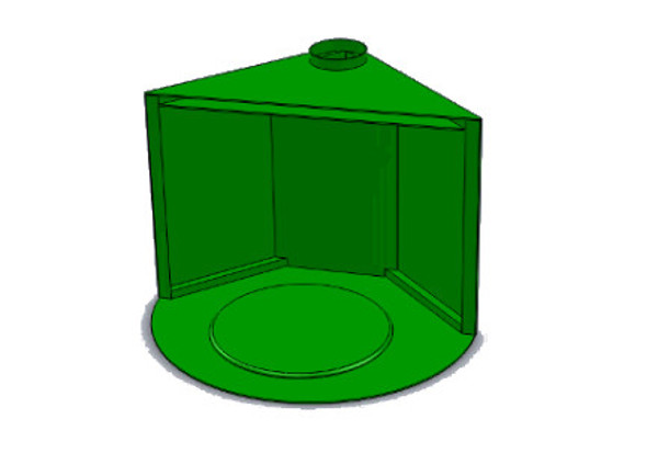 The spray booth consists of a box with a triangular footprint. Each side of the triangle is 50 cm, and the height of the booth is also 50 cm. The back of the booth has a hole for a fan, and the back-plate will be used to hold a filter.