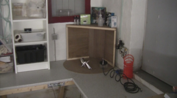The spray-booth sits in the corner of my workshop near a south-facing window and in summer, it will have excellent lighting. Directly over the spray-booth there is a built-in cabinet, and to the right there is a connection for air from my compressor. I will add a paint-pot door hanger later for the cabinet door.